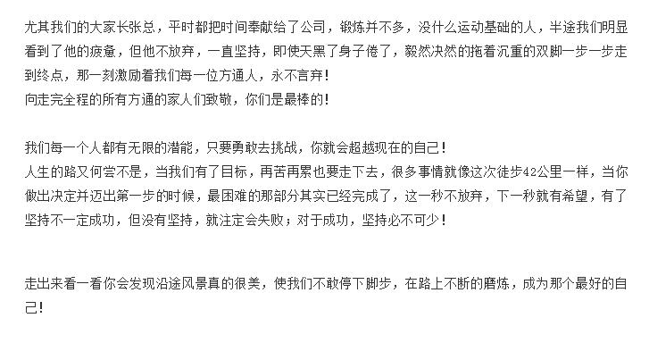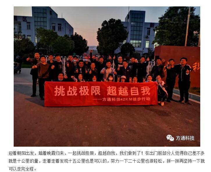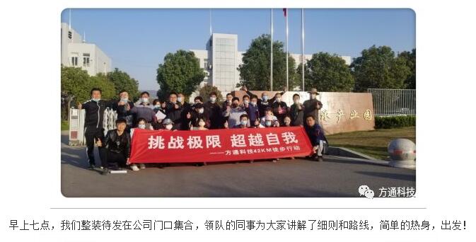 正如剛剛過(guò)去的周五,我們方通人舉行了全程42公里的徒步活動(dòng),方案出來(lái)時(shí)有人認為這個(gè)數字太難了,但我們所有的方通人并不畏懼,而是愿意去嘗試,去挑戰,因為不尋常,更要去超越!