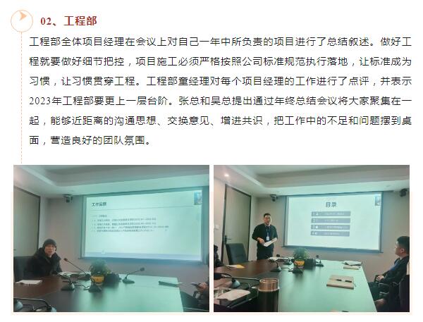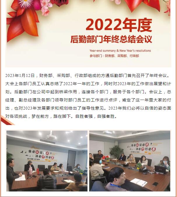 •      2022方通科技年終總結會(huì )議,光陰荏苒,時(shí)光流逝,方通科技上下一心,團結協(xié)作,順利完成了2022年度計劃。忙碌而不平凡的2022已落下帷幕,為了進(jìn)一步總結經(jīng)驗,更好地為今后工作開(kāi)展夯實(shí)基礎,我們于1月12日至1月18日召開(kāi)了各部門(mén)年終總結會(huì )議。